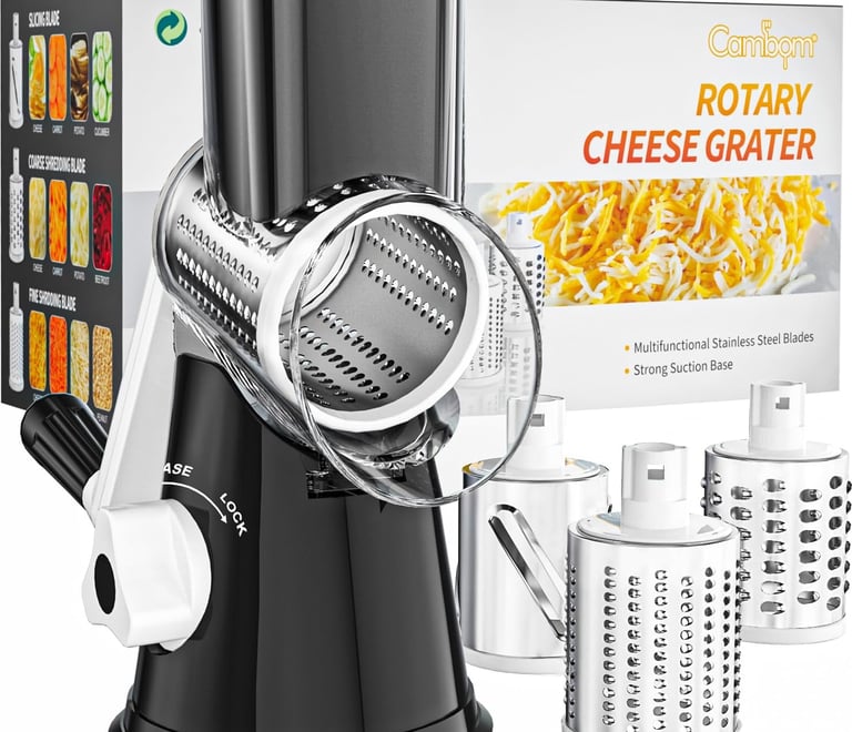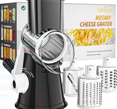 Save time in the kitchen with this rotary cheese grater. Hand crank design, strong suction base, sharp stainless blades for cheese, vegetables, nuts, and quick mess-free prep.
