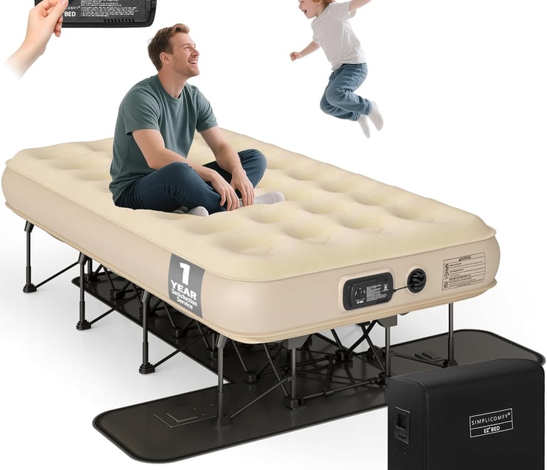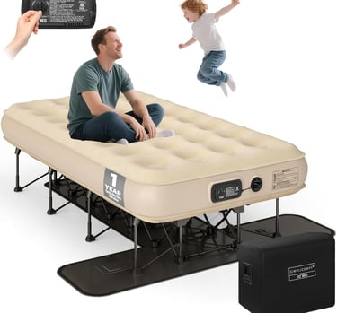 Enjoy real-bed comfort anywhere with this self-inflating EZ Bed air mattress. Built-in frame and pump set up in minutes, elevated design, easy storage with wheeled case.