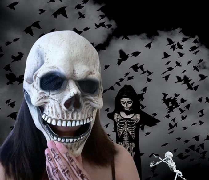 Unleash real fear with this moving jaw skull mask. Realistic latex design reacts as you move your mouth, perfect for Halloween, cosplay parties, haunted houses, or spooky décor displays.