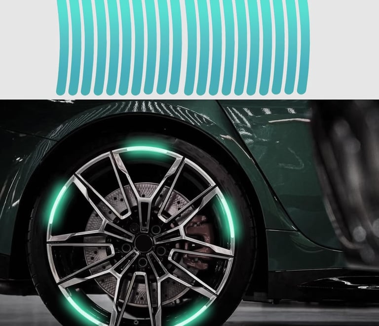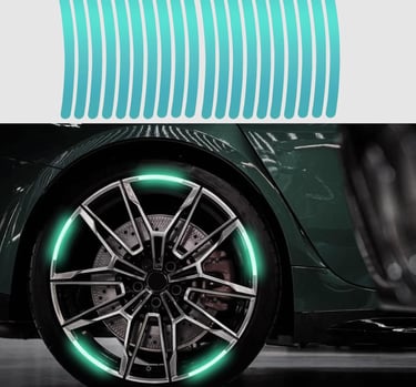 Enhance night visibility with these reflective rim stickers. Made of durable PET, waterproof, UV-resistant, and easy to apply. Adds a stylish glow while improving safety for cars, bikes, and motorcycles.