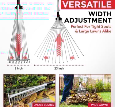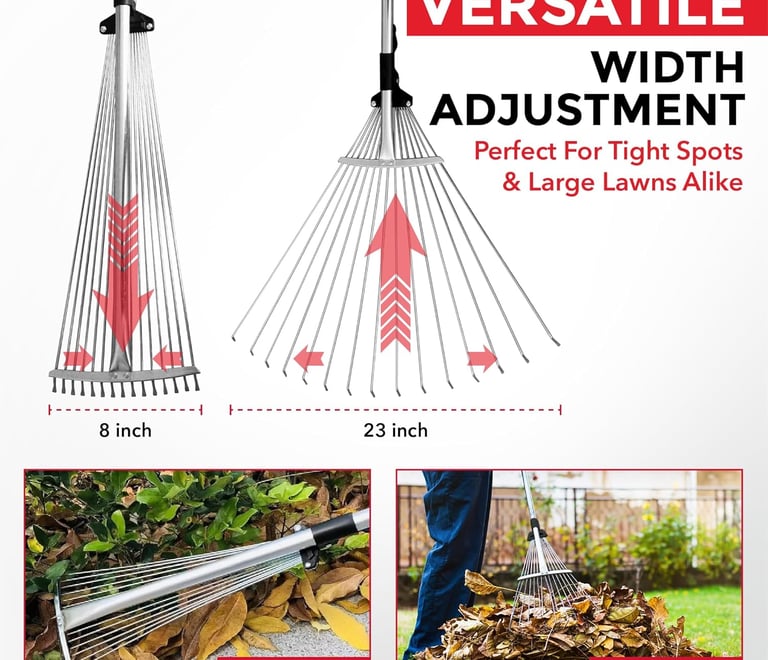 Quickly sweep leaves and small debris with this adjustable metal rake. Telescopic handle extends from 32" to 63" and the fan head spans 8"–23", perfect for tight spaces or wide lawns. Durable, lightweight, and easy to store.