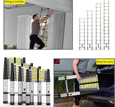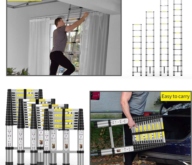 Reach new heights safely with this 12.5FT aluminum telescoping ladder. Lightweight, easy to carry with included bag, perfect for indoor or outdoor household tasks.